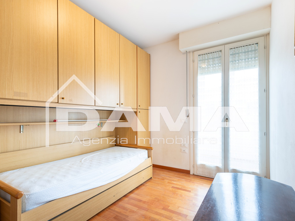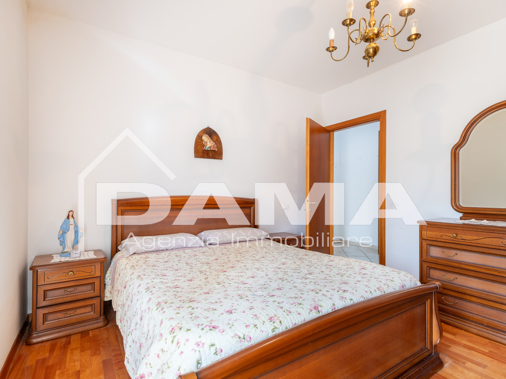 La zona notte, riservata e silenziosa, si apre con un disimpegno che conduce alle due camere da letto, rifinite con parquet, e ai due servizi: il bagno principale, dotato di box doccia e attacchi per la lavatrice, e un pratico bagno di servizio.
