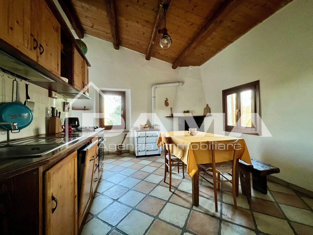 Cucina abitabile con ulteriore camino, perfetta per cucinare e godersi il calore nei mesi più freddi. La cucina si apre direttamente sul patio grazie a una comoda porta finestra, regalando uno sbocco ideale per vivere gli spazi esterni, oltre ad un servizio sul piano e due camere matrimoniali.